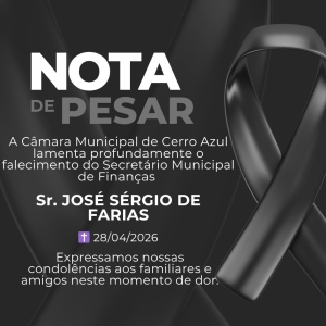 A Câmara Municipal de Cerro Azul manifesta o mais profundo pesar pelo falecimento do Secretário Municipal de Finanças, Sr. Sérgio José de Farias, ocor